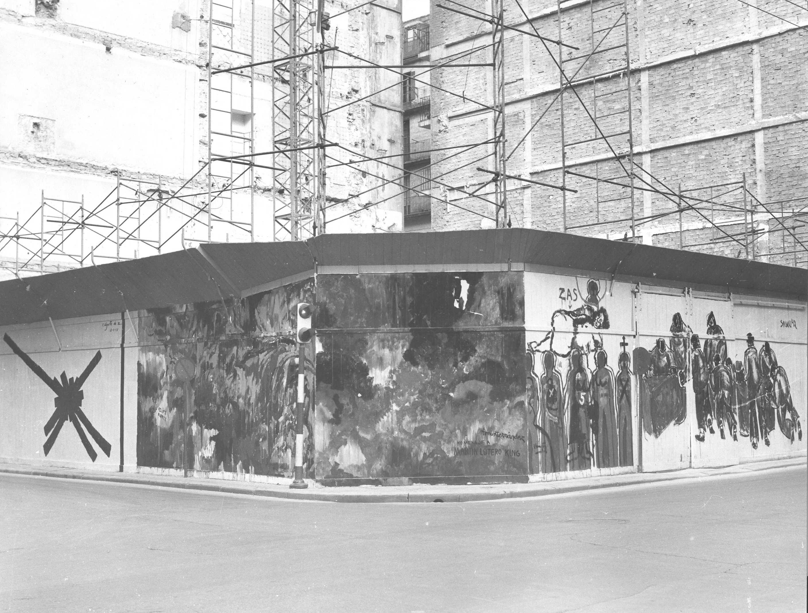 Fotografías de una pintura realizada sobre las vallas de una obra en la Avenida de la Libertad esquina con la calle Bergara