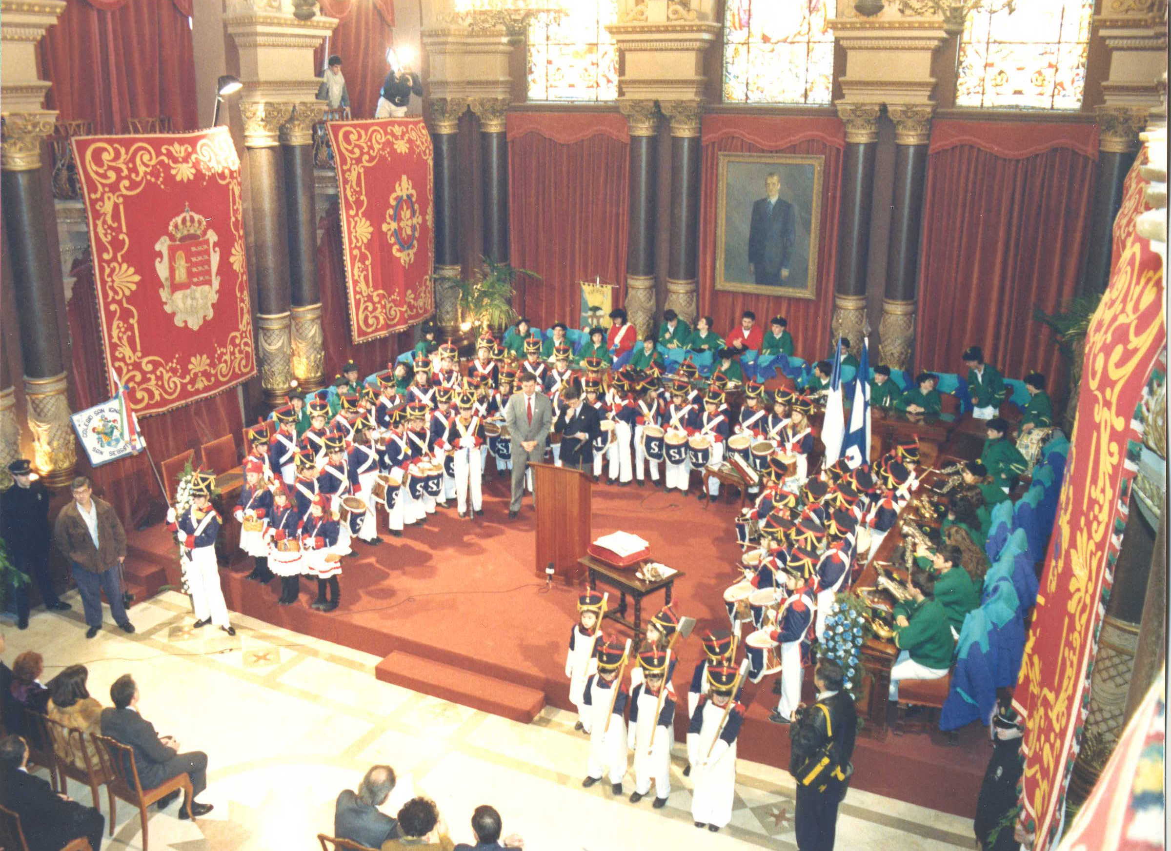 Fotografía de la entrega del Tambor de Oro de 1990 a Emil Zatopek y Paco Ramos donde aparece la Compañía del Colegio San Ignacio