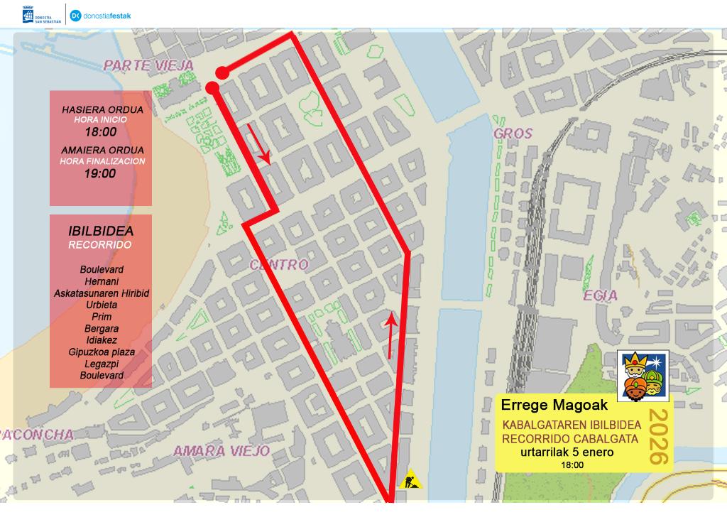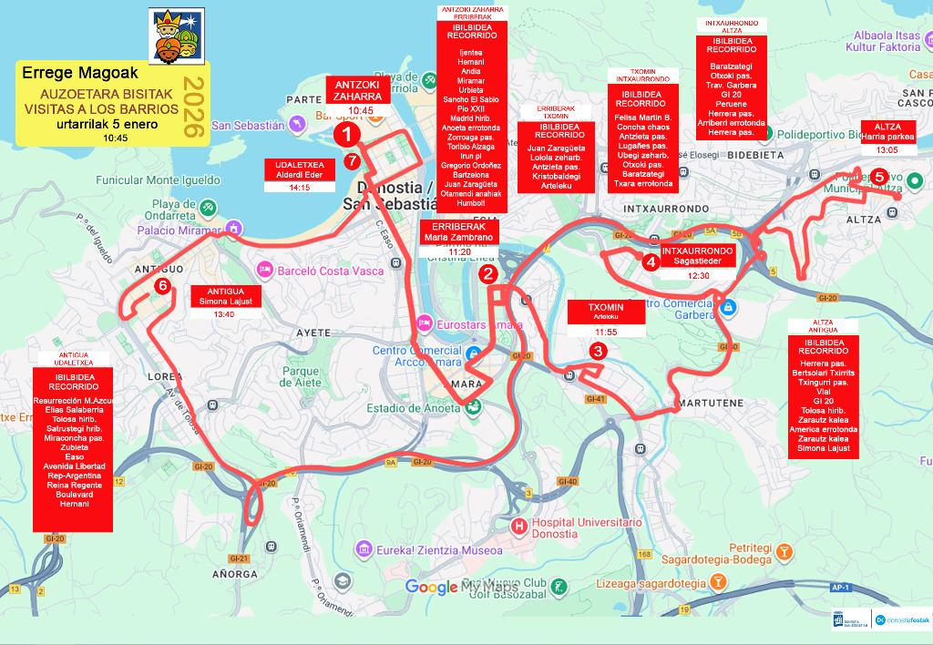 - Erdialdea eta Amara Berri auzoak zeharkatuta, Loiolako Erriberetara joango dira, Maria Zanbrano plazan dauden haur guztiak agurtzera (11:20ak aldera)