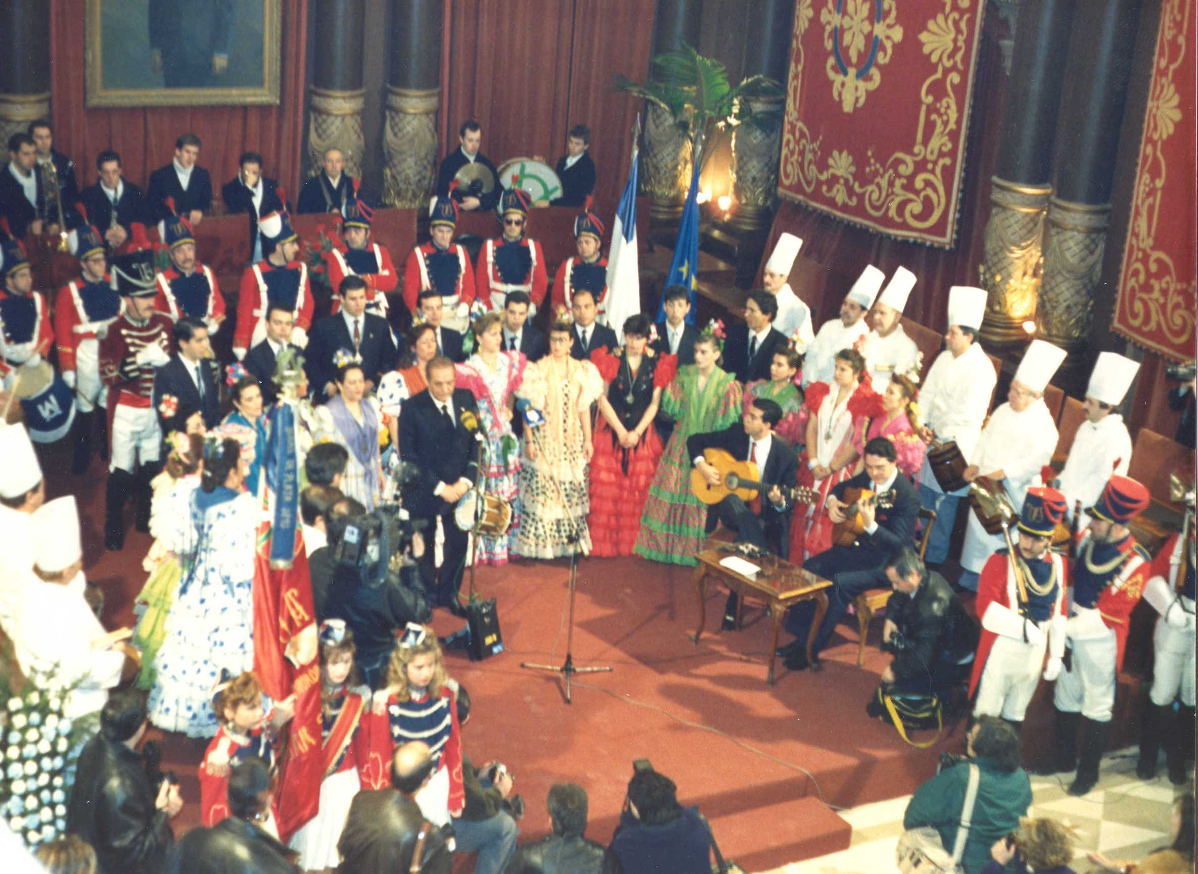 Fotografía de la entrega del Tambor de Oro de 1990 a Emil Zatopek y Paco Ramos donde aparece la Compañía del Colegio San Ignacio