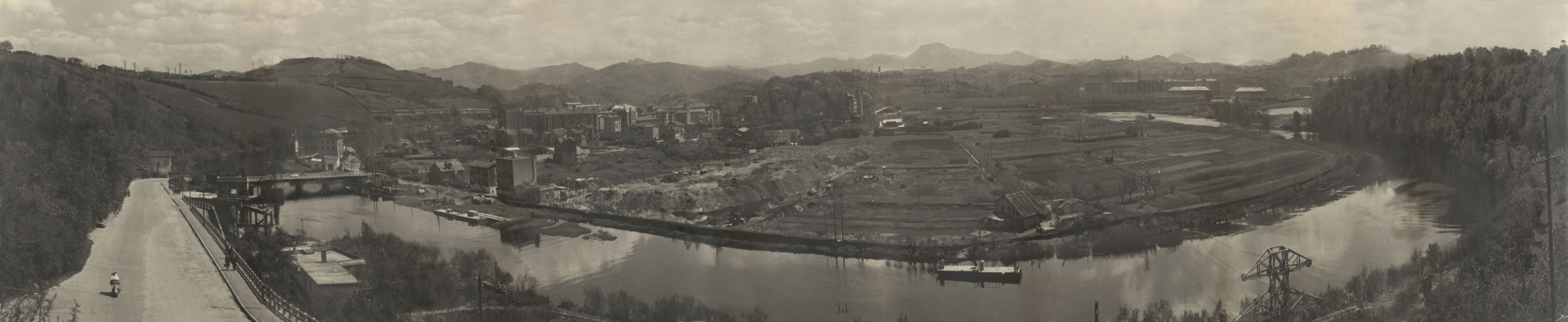 Loiolako erriberak, Loiola, Amara eta Urumea ibaia, 1970. Pinuen gainetik (Egia kalea eta Alkolea parkea bat egiten duten puntutik) ateratako ikuspegi panoramikoa. Oso ondo ikusten da Urumeak egiten duen meandroa, non orain Loiolako erriberak bezala ezagutzen dugun auzoa eraiki zen (2006). Atzean Astiñeneko zubia = Vista panorámica desde el Alto de los Pinos (donde confluyen la calle Egia y el parque Alkolea). Se ve muy bien el meandro que hace el Urumea, donde se construyó el barrio que ahora conocemos como Riberas de Loiola (2006). Al fondo el puente de Astiñene.