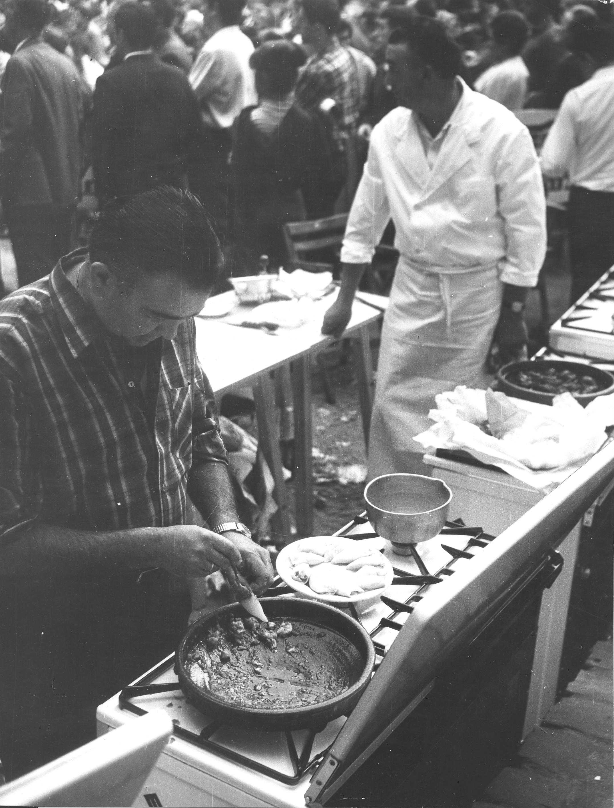 Fondo procedente del Centro de Atracción y Turismo Fotografía de un concurso gastronómico celebrado en la Plaza de la Trinidad de San Sebastián durante las Euskal Jaiak de 1967