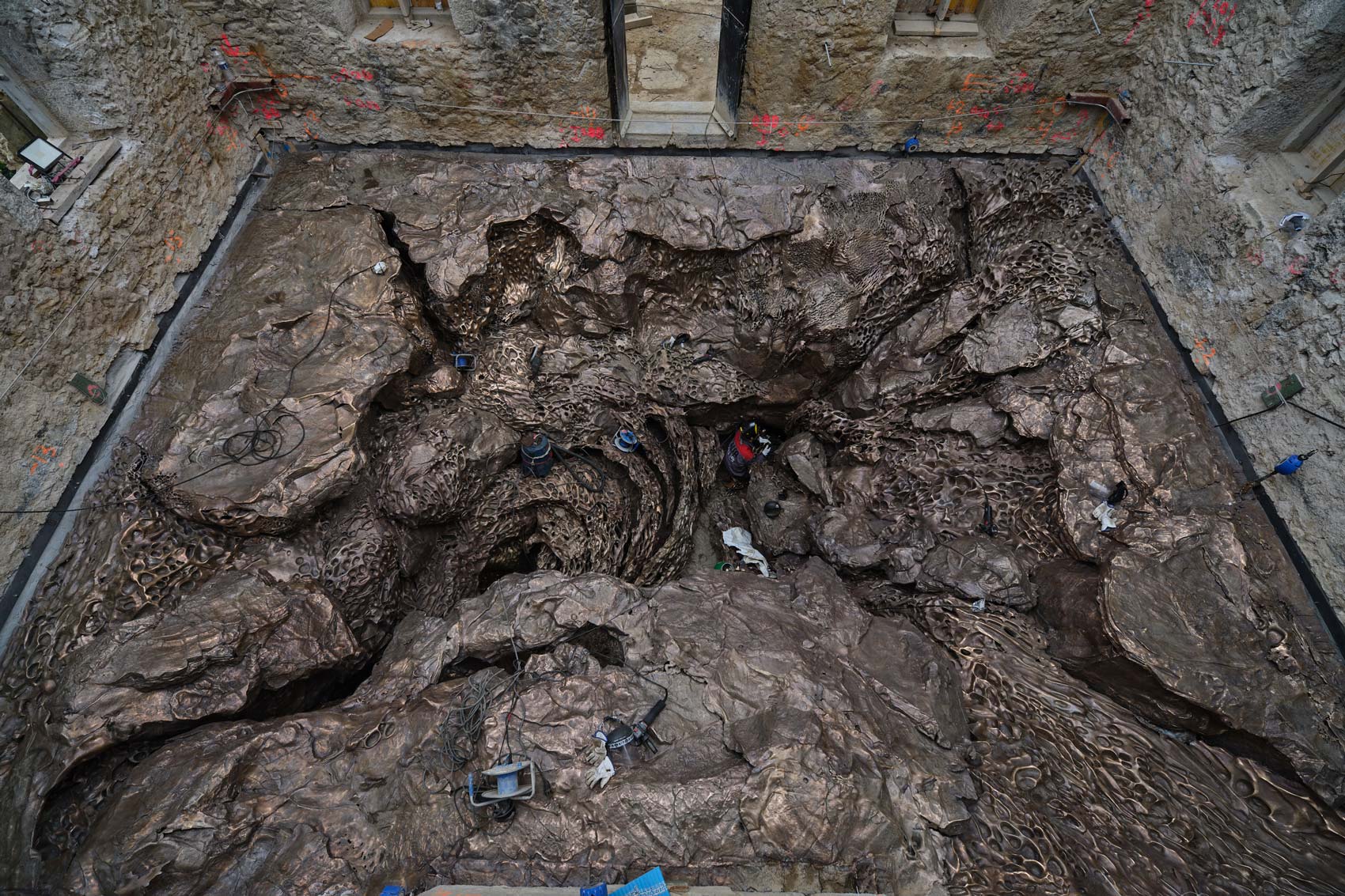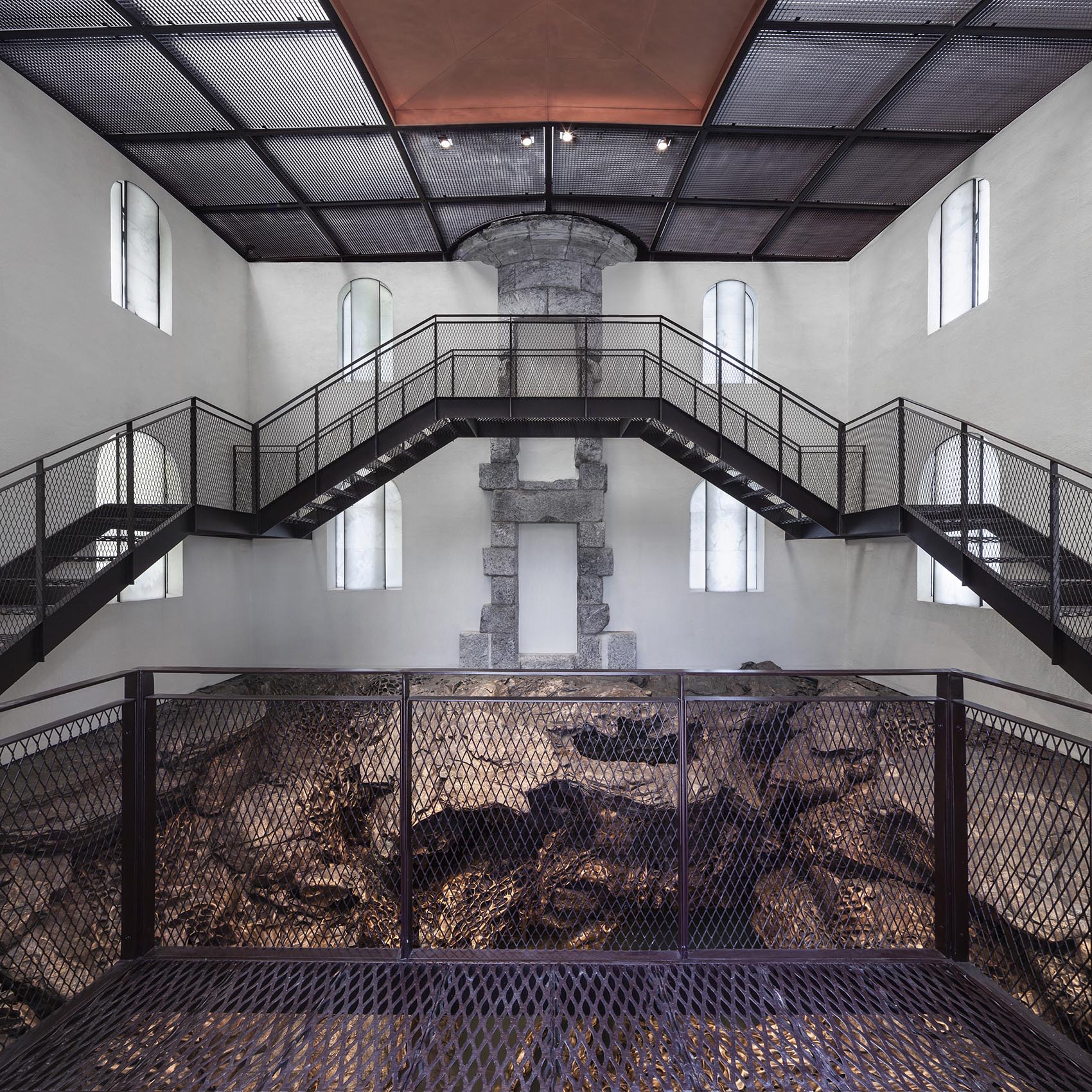 Excavated inside the hollowed-out lighthouse, Iglesias's work incorporates the peculiar geology and ecology of the Basque coast and the wild waters of the ocean that surround the island.
