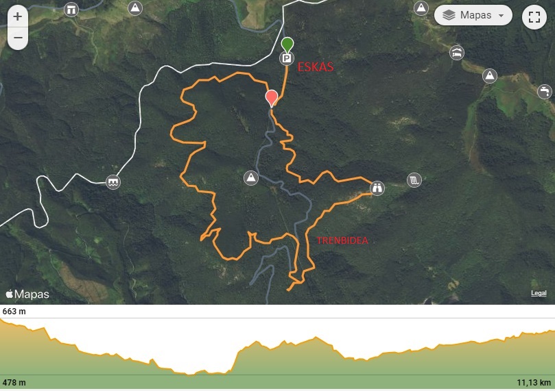 La pista de Mintegixar nos llevará de nuevo hasta la carretera, y desde ahí tomaremos el trazado del antiguo ferrocarril minero para regresar a Eskas.