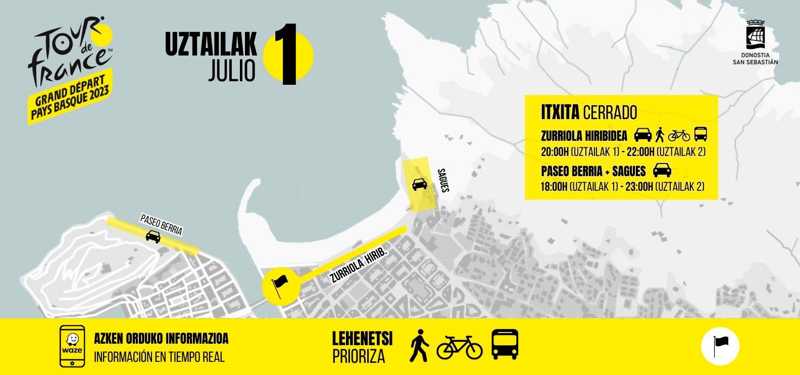 - Sagues eta Pasealeku Berria uztailaren 1eko 18:00etatik aurrera ibilgailuentzat izango da itxita, eta uztailaren 2ko 23:00etan irekiko dira berriz.