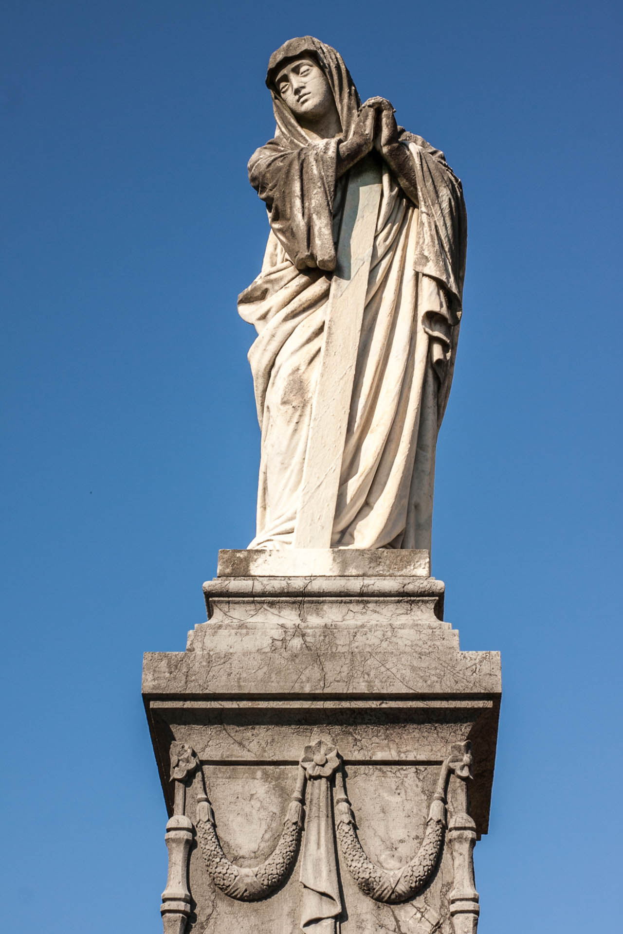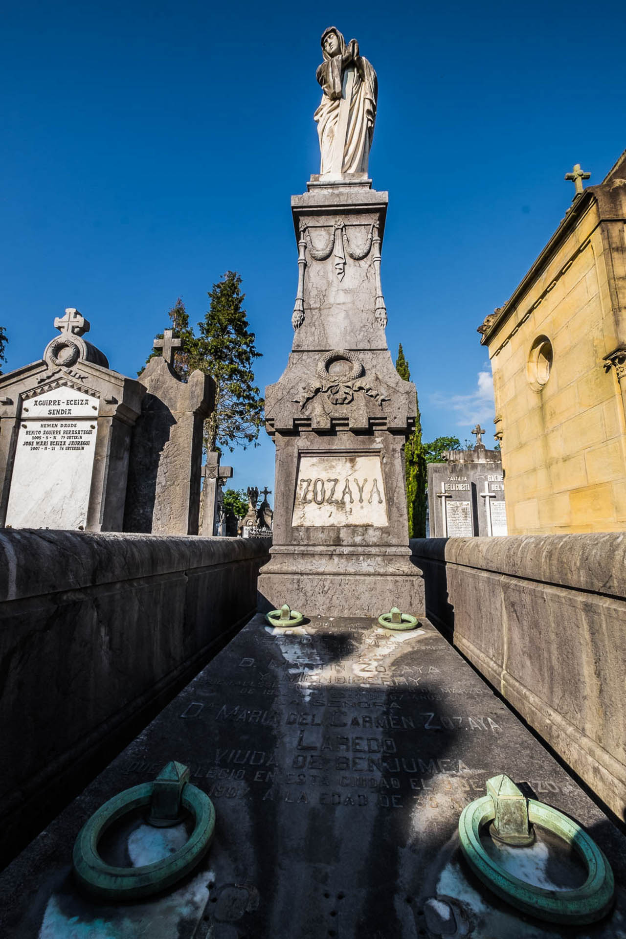 Klasizismoa. Oinarri altu bat, itxura klasikokoa, eta inguruan ehorzketa-artearenak diren apaingarriak; hala nola alderantziz dagoen zuzia, girlandak edo hil-oihala. Horrek guztiak oinarria eratzen du, eta gainean Erlijioaren irudia dago, 1891ean, Jacinto Mateu eskultoreak egindakoa, tunika zabal batez estalia dagoen emakume gisa irudikatua. Gaur egun gurutzearen errematea falta zaio, hots, esku artean duen zutoinarena.Bi zokalo trinko eta altu daude bi hilobien alboetan, eta babesleku moduko bat sortzen dute bien artean.