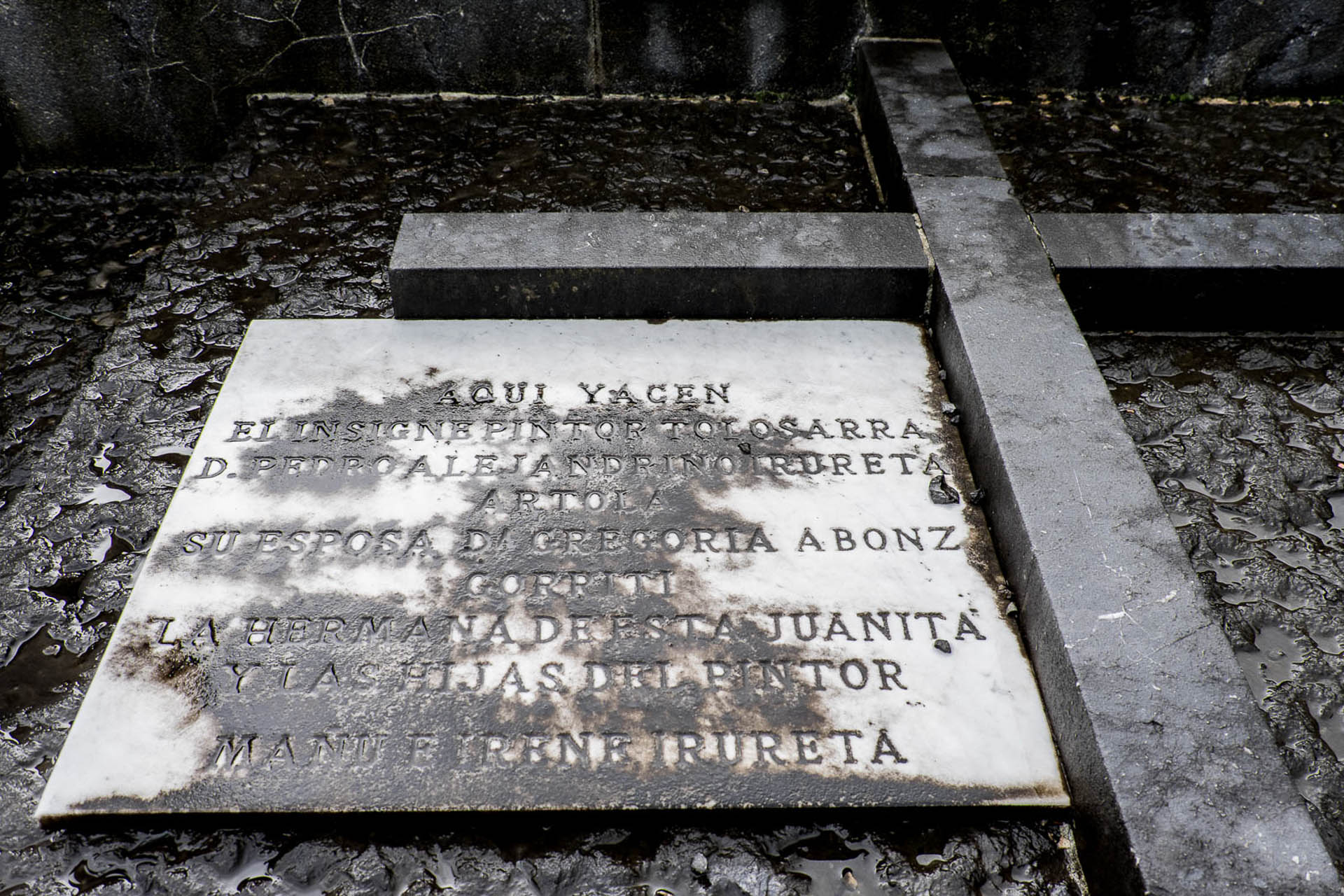Marmolezko plaka xume batek adierazten du hemen Pedro Alejandrino Irureta Artola (*1854 Tolosa +1912 Donostia) ehortzi zela. Jaioterrian bertan hasi zuen prestakuntza artistikoa, Laureano Gordón margolari, grabatzaile eta argazkilari ezagunarekin. Gasteizko Arte Ederren Akademian jarraitu zuen trebatzen, eta Bartzelonako La Lonja-ko Eskolan eta San Fernandoko Arte Ederren Eskolan, Madrilen. Han, Villegas eta Madrazoren ikasgaiak jaso zituen, besteak beste. Hark, Alejandrinok aurkeztutako proba baten aurrean, epaimahaiak ez ziola oniritzirik ematen ikusita, hauxe aipatu zuen: "Iruretaren ariketa estudiorik onena da, haren irudi biluziak apartekoak dira eta zorionik beroenak ematen dizkiot". 1870ean Erromara joan zen, Gipuzkoako Foru Aldundiak bidalita, eta han José Ignacio Luis Echenagusia ‘Echena' bere lagun min eta margolariarekin bat egin zuen.