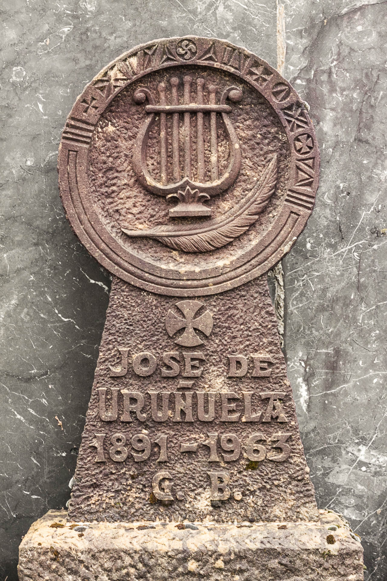 Hemen hizpide dugunak, dimentsioari eta materialari dagokienez, antzinako ereduen antza du. Ikurrak erabiltzen ditu ─Erdi Aroko esteletan ikusten dugu hori─, eta hala, hildakoak bizitzan zehar garatu zituen gaitasunak adierazten dizkigu: lira bat, koblakariaren atributua, eta luma, musikagile seinale. Grafiaren karaktereetarako, "euskal estilo" deritzon trazua baliatu da. G.B. hizkiek Goian Bego adierazten dute.