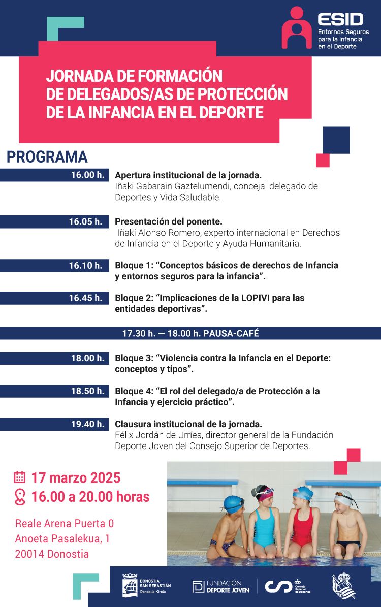 El próximo 17 de marzo, lunes, Donostia Kirola y la Fundación Deporte Joven del Consejo Superior de Deportes han organizado una Jornada de Formación de delegados/as de protección de la infancia en el deporte. La jornada se desarrollará en la sala de la Puerta 0 del Estadio de Anoeta, de 16:00h a 20:00 horas
